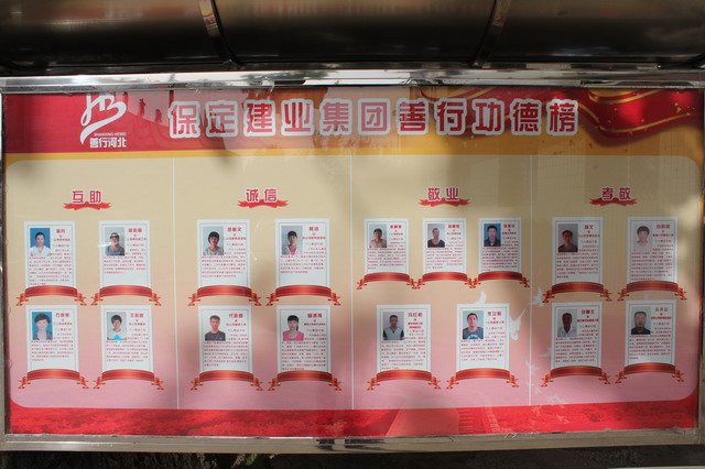 善行功德榜分為“互助、誠信、敬業、孝敬”四個方面,共計展示了道德模范17人,全部由分公司一線員工組成,他們勤勤懇懇、兢兢業業,在平凡的工作崗位上創造了不平凡的業績。